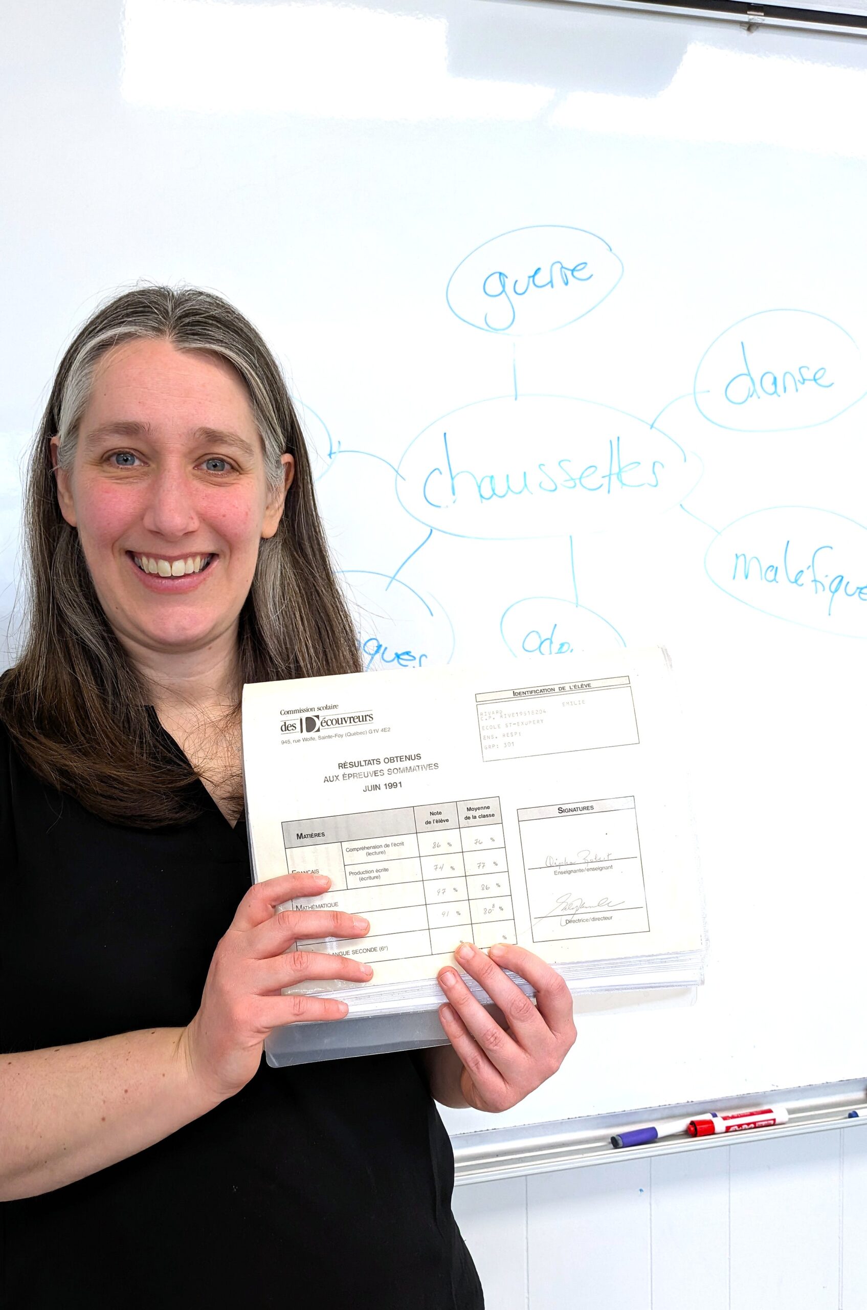 Spécialiste du roman policier, Émilie a dévoilé les secrets d’une bonne enquête. (On vous le donne : commencer par choisir un coupable!) Elle a aussi montré que l’inspiration peut venir de partout, même d’un mot plate comme «chaussettes». Avec la participation des élèves, Émilie a créé un nuage de mots inspirants qui pourraient donner vie à une super histoire de chaussettes maléfiques ou de bas magiques. Elle a surpris les enfants en partageant son bulletin de troisième année : sa meilleure note n’était pas en français, comme on pourrait s’y attendre, mais en… maths! Étonnant pour quelqu’un qui en est à quelque chose comme son centième livre, non?