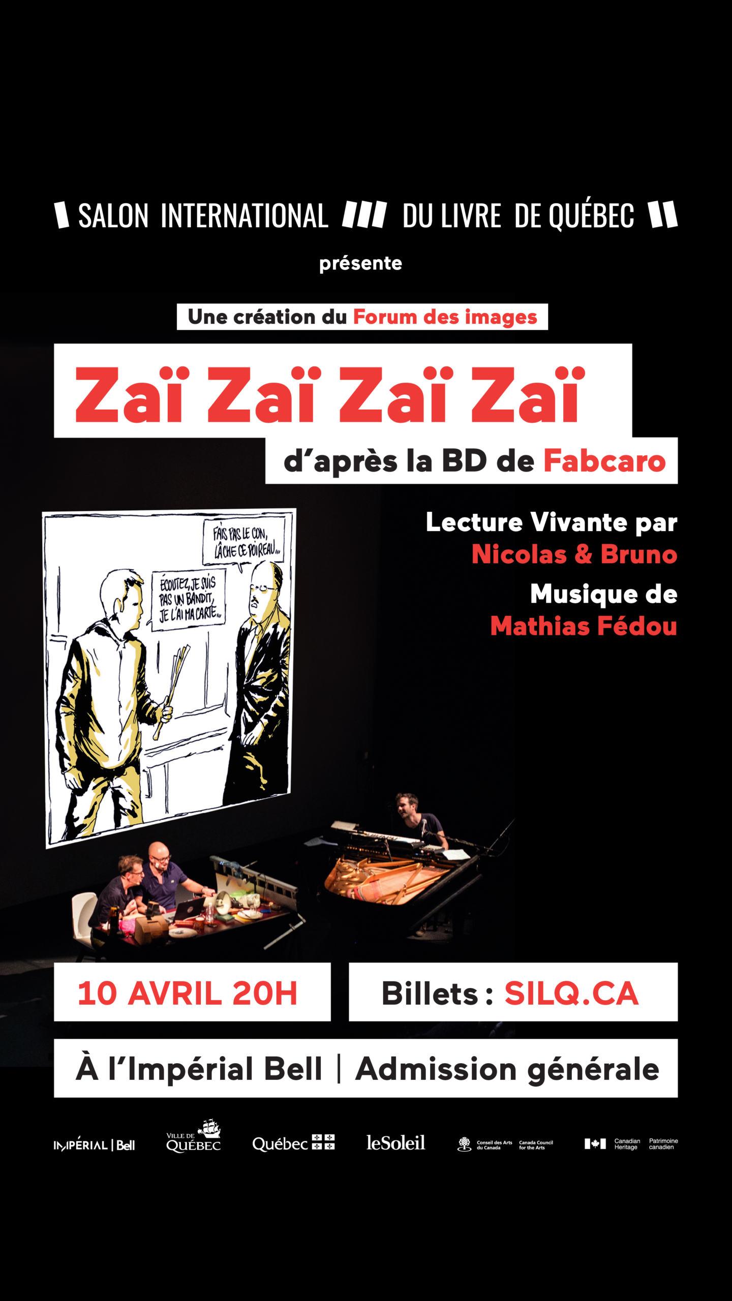 Le Salon international du livre de Québec (SILQ) 2026, présenté par Radio-Canada et Le Soleil, est fier d’annoncer la venue exceptionnelle du spectacle de «lecture vivante» Zaï Zaï Zaï Zaï d’après la BD de Fabcaro, qui célèbre cette année ses 10 ans, pour une seule représentation à Québec, vendredi 10 avril 2026 à l’Impérial Bell. Les billets entrent en vente le mardi 12 janvier à 10 heures.